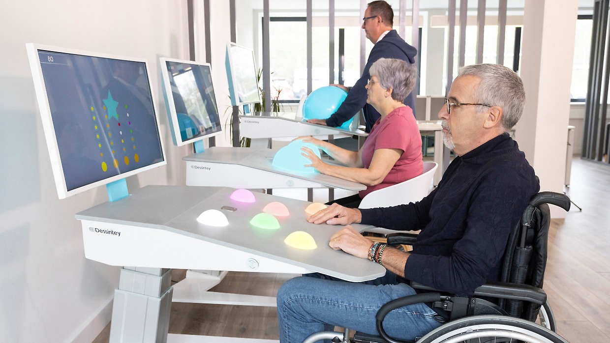 Die alternde Bevölkerung ist eine Herausforderung für die Gesundheitssysteme. Wir müssen gemeinsam Lösungen für intensive und diversifizierte Therapiepfade entwickeln. Mit den derzeitigen Therapieressourcen und -Organisationen wird es immer schwieriger internationale Richtlinien in Bezug auf Therapieintensität und -Häufigkeit zu erfüllen, insbesondere in der Neurorehabilitation. Die Weltschlaganfallorganisation empfiehlt 3 Stunden Rehabilitation pro Tag nach einem Schlaganfall. Studien zeigen, dass die Erhöhung der Trainingszeit der Patienten ein wesentlicher Faktor für die funktionelle Erholung und die Wiedererlangung der Selbstständigkeit ist. Unsere Vision: the Guided Self-Rehabilitation Concept Es ist wichtig, die Patienten in ihren Rehabilitationsprozess einzubeziehen. Therapeuten und Angehörige sollten sie motivieren, sich mehr im Alltag zu bewegen. Die Integration eines angeleiteten Eigentrainings in den Behandlungspfad trägt dazu bei, die Zeit der Inaktivität zu verringern, und macht den Patienten zum Akteur seiner eigenen Rehabilitation. Es festigt und verbessert die motorische Erholung zusätzlich zur konventionellen Therapie. Dank diesem innovativen Ansatz wird das Risiko des Verlusts der körperlichen Leistungsfähigkeit und Selbstständigkeit verringert. Die Therapeuten bleiben im Mittelpunkt und geben ihren Patienten Übungen, die individuell am eigenen Rehabilitationsstatus angepasst sind.